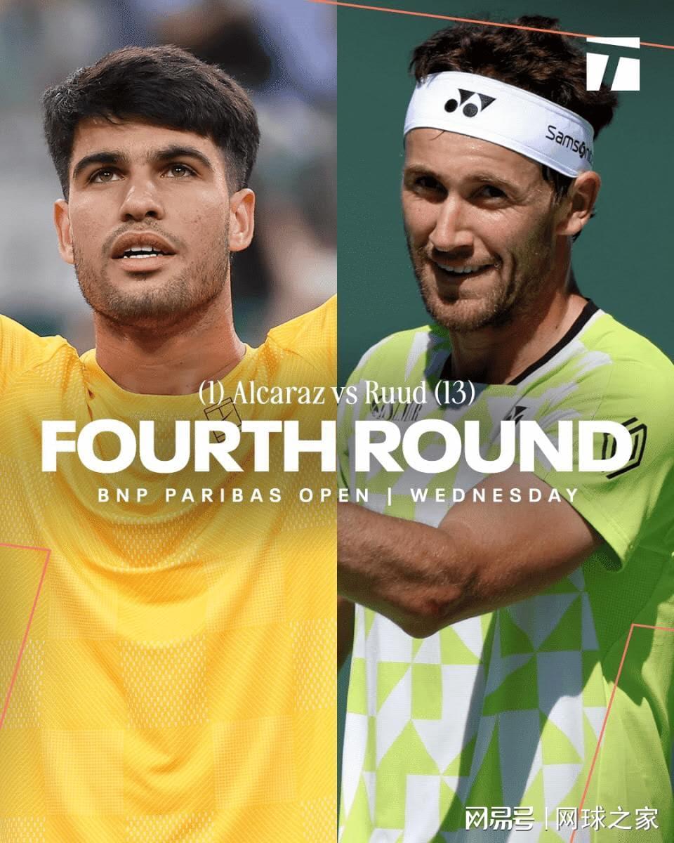 明天凌晨五点,印第安维尔斯大师赛1/8决赛,且看挪威之光鲁德奋起直追、大发神威,英勇鏖战世界第一阿尔卡拉斯。